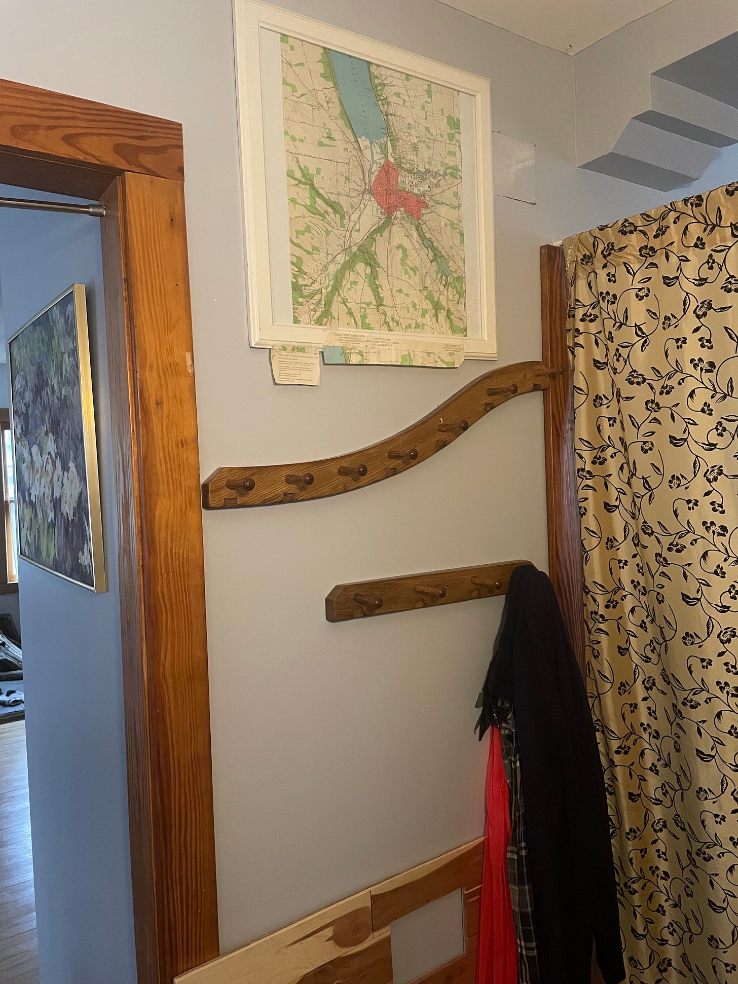 Soundboard riser that Mike sanded, stained, and polyurethaned. The curved wood was a good fit for the space. Above: a USGS map of Ithaca
