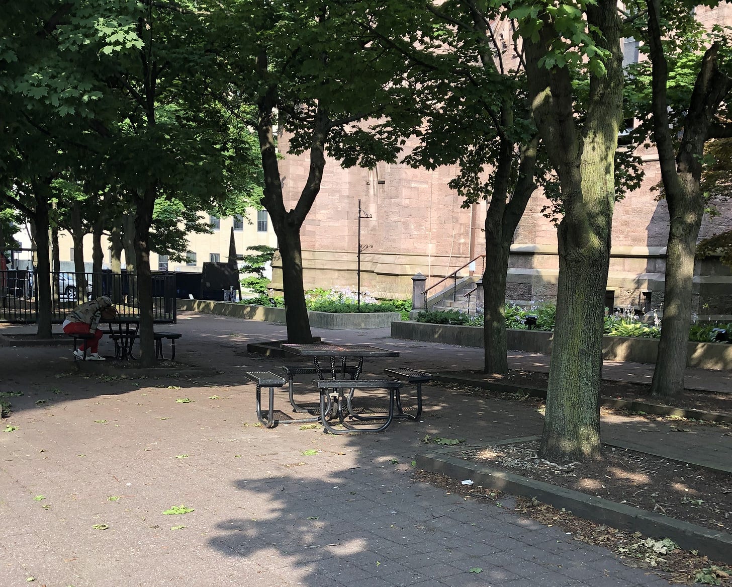 This summer I went back to Buffalo with my daughter, Anna; her husband, Robert; and their two-year-old, Issy. We found that Hughes (304 Main Street) had turned into Bubble Tea World. The owners (Taiwanese?) were gracious enough to allow me inside. The inside bore no resemblance to what I remembered: high black tables, stools, black and white tile, all fashionable back in the 70s. I asked to go downstairs. An odd request, but I hoped there was something that had not changed. Wish granted: the stairs were still the same: narrow, dangerously steep, and cacked with decades of dirt and grime. Behind Bubble Tea World, and this I recalled too, was Cathedral Park and St. Paul’s Episcopal Church. The park now had a modest playground of the usual tunnels and slides. As Issy was gearing up for a few moments of real playground action, a woman driving by in a car, opened her window and said, “Don’t let him play there. It’s where all the homeless sleep.”